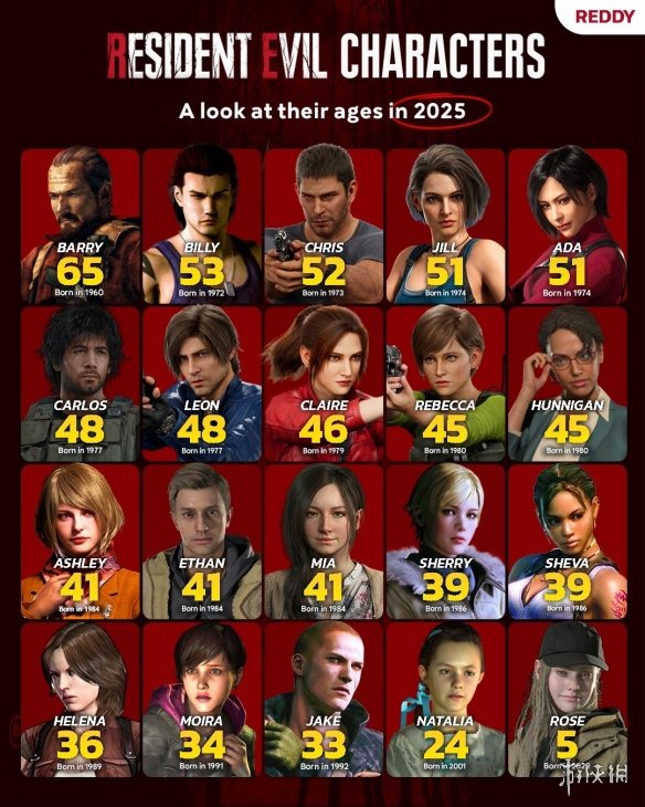Capcom的《生化危机》系列因其长久的历史,使得其众多角色在游戏时间线中也已步入中老年。随着传闻里昂将以“老年形态”在《生化危机9》中回归,玩家们不禁好奇其他经典角色如今的年龄。根据Reddit玩家基于官方设定和推测的汇总,以下是截至2025年系列主要角色的年龄情况(部分角色因感染病毒或霉菌,衰老速度可能异于常人):