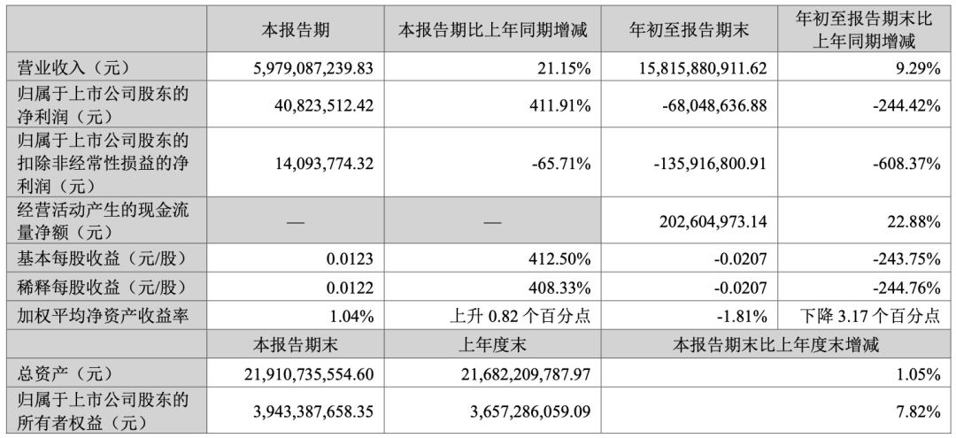 前三季度营业收入158.16亿元,同比增长9.29%;净利润亏损6804.86万元,上年同期盈利4711.92万元;扣非更是亏损1.36亿元。
